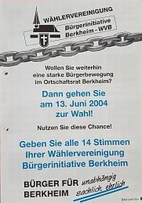 2004   Die von mehreren von der Gemeindereform betroffenen Gemeinden eingereichten Klagen zu ihrer Rückgängigmachung scheitern wegen hoher Prozesskosten und dem ungewissen Ausgang. Auch die WVB gibt daher ihr Ziel auf, die Selbständigkeit Berkheim wieder zu erlangen. Als die Ortschaftsverfassung und Ortschaftsverwaltung aufgehoben werden sollen, strebt der Ortschaftsrat eine Klage an, um dies zu verhindern. Soweit kommt es jedoch nicht. Im Gegenzug wird die Ortschaftsverfassung bis 2009 verlängert. Bei der letzten Ortschaftsratswahl vor Aufhebung der Ortschaftsverfassung gewinnt die WVB 2 von 14 Sitzen.